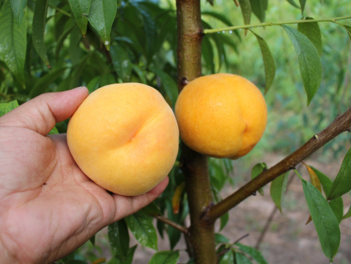 7月下旬成熟,果實圓形,果面30%以上著紅色,套袋金黃色,單果重260克,大果410克,果肉黃色,半溶質(zhì),風味純甜,含糖量16%,粘核,自花授粉,極豐產(chǎn)。