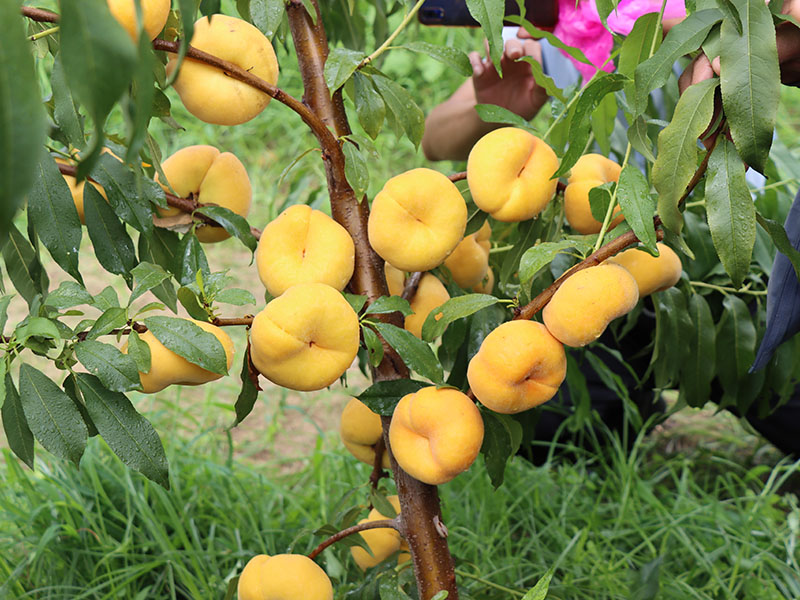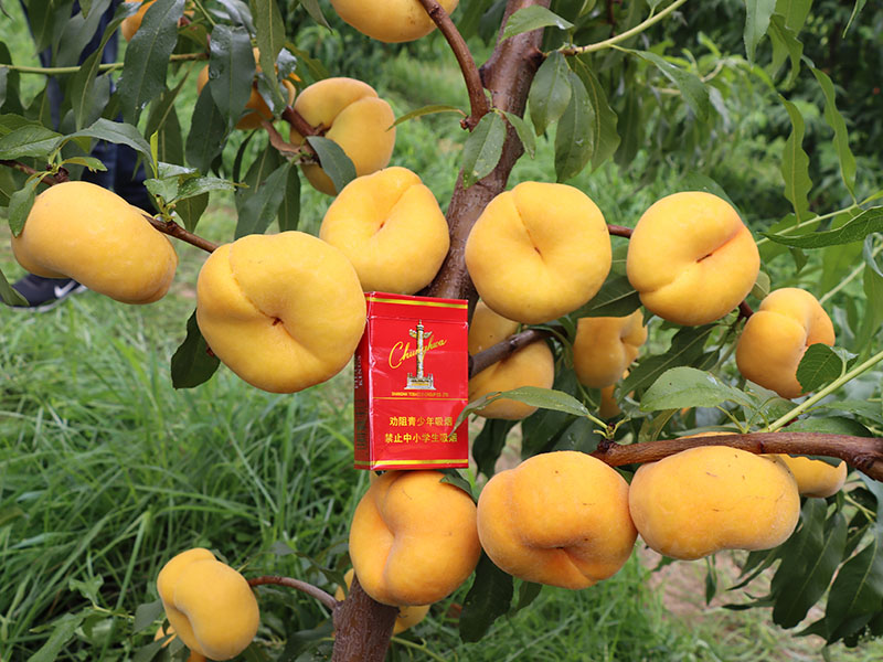 晚熟黃肉蟠桃品種,8月初成熟,果實(shí)發(fā)育期123天,單果重185-226克,風(fēng)味濃甜,含糖15-18%,粘核,有花粉,豐產(chǎn)。